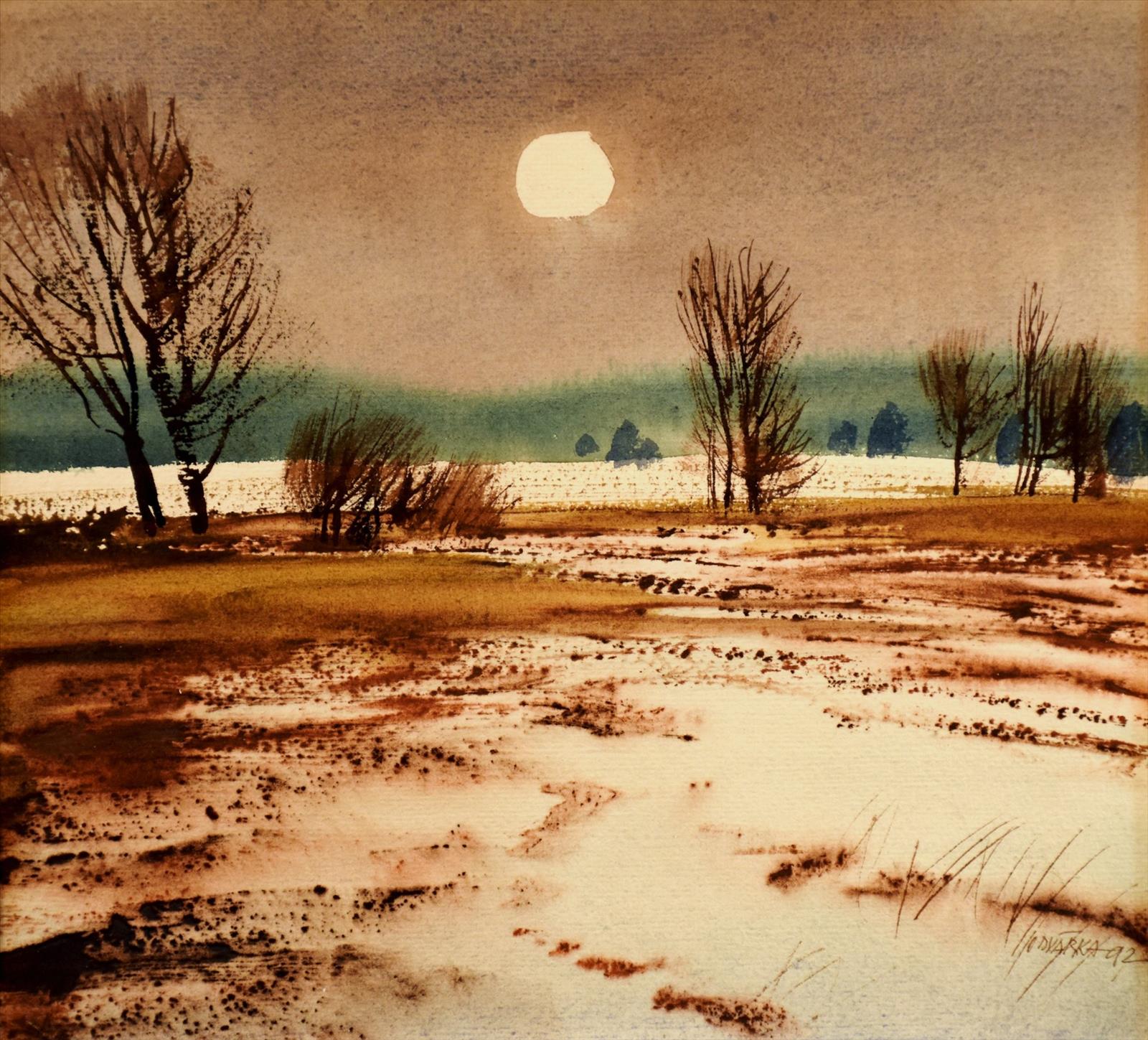 Akvarel, papír, 26 cm x 29 cm. Signováno a datováno vpravo dole. Zaskleno.