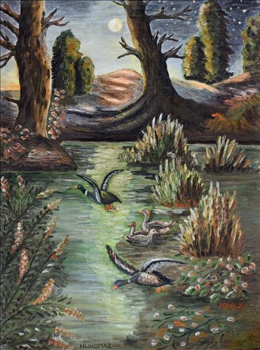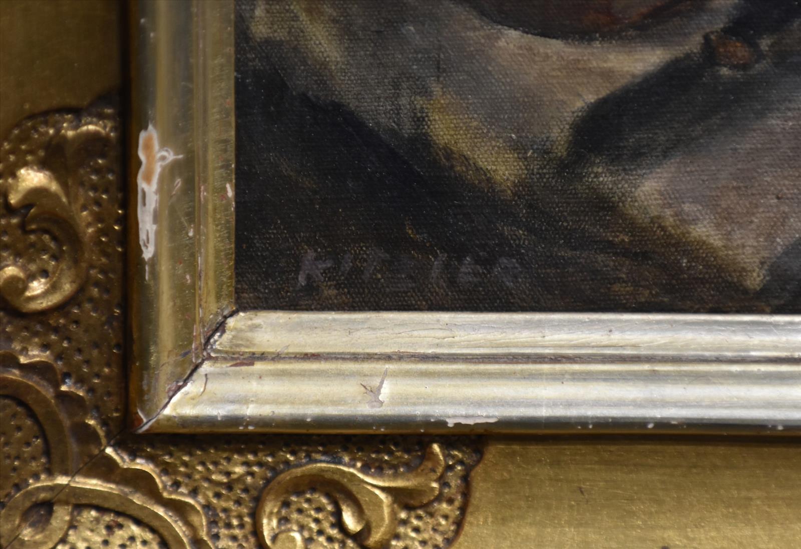 Olej, plátno, 30 cm x 35 cm. Signováno vlevo dole. Rám i malba místy poškozena.