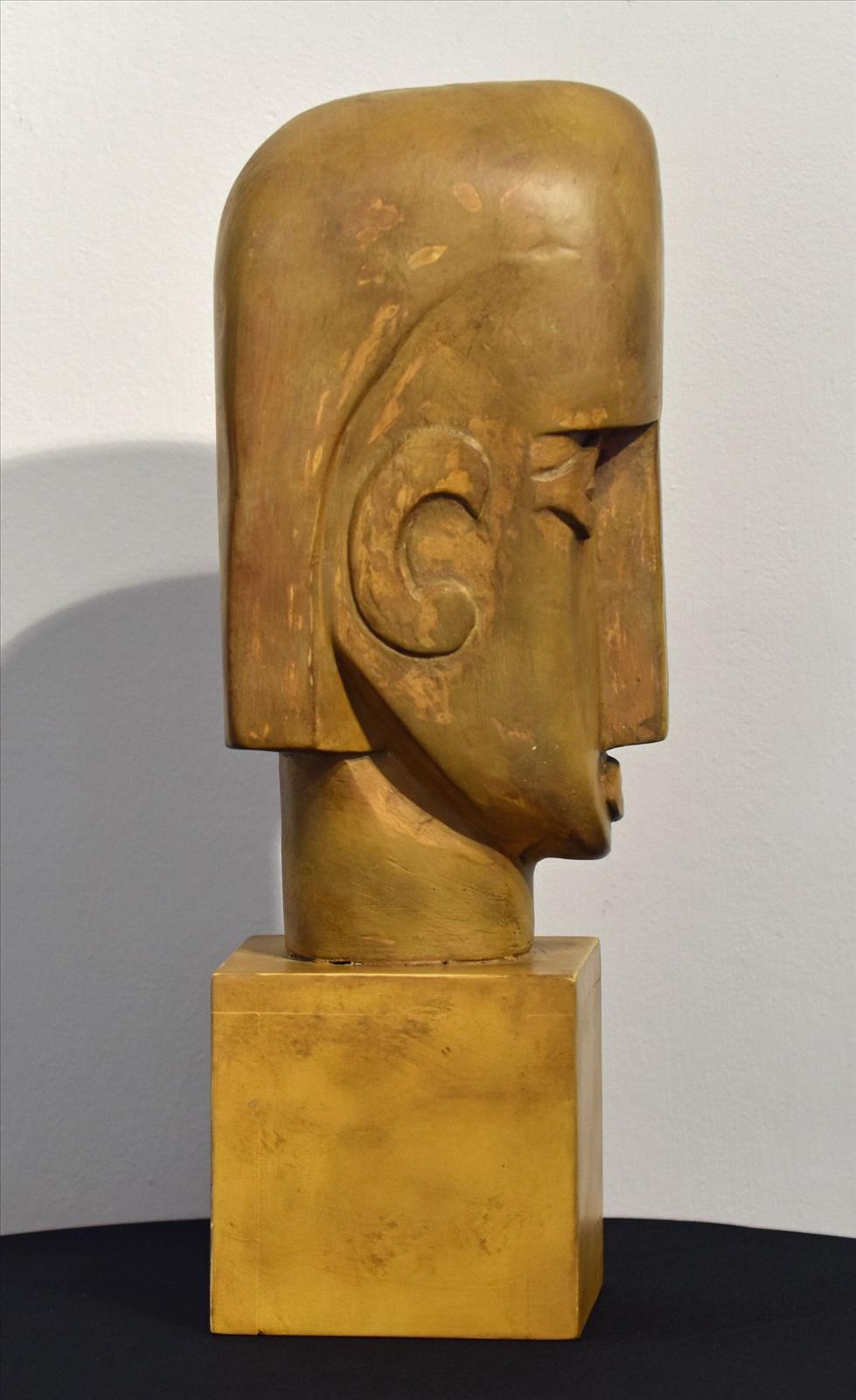 Patinovaná sádra, výška bez podstavce 36 cm, s podstavcem 52 cm. Dřevěný podstavec. Nesignováno. Pravděpodobně novější odlitek.