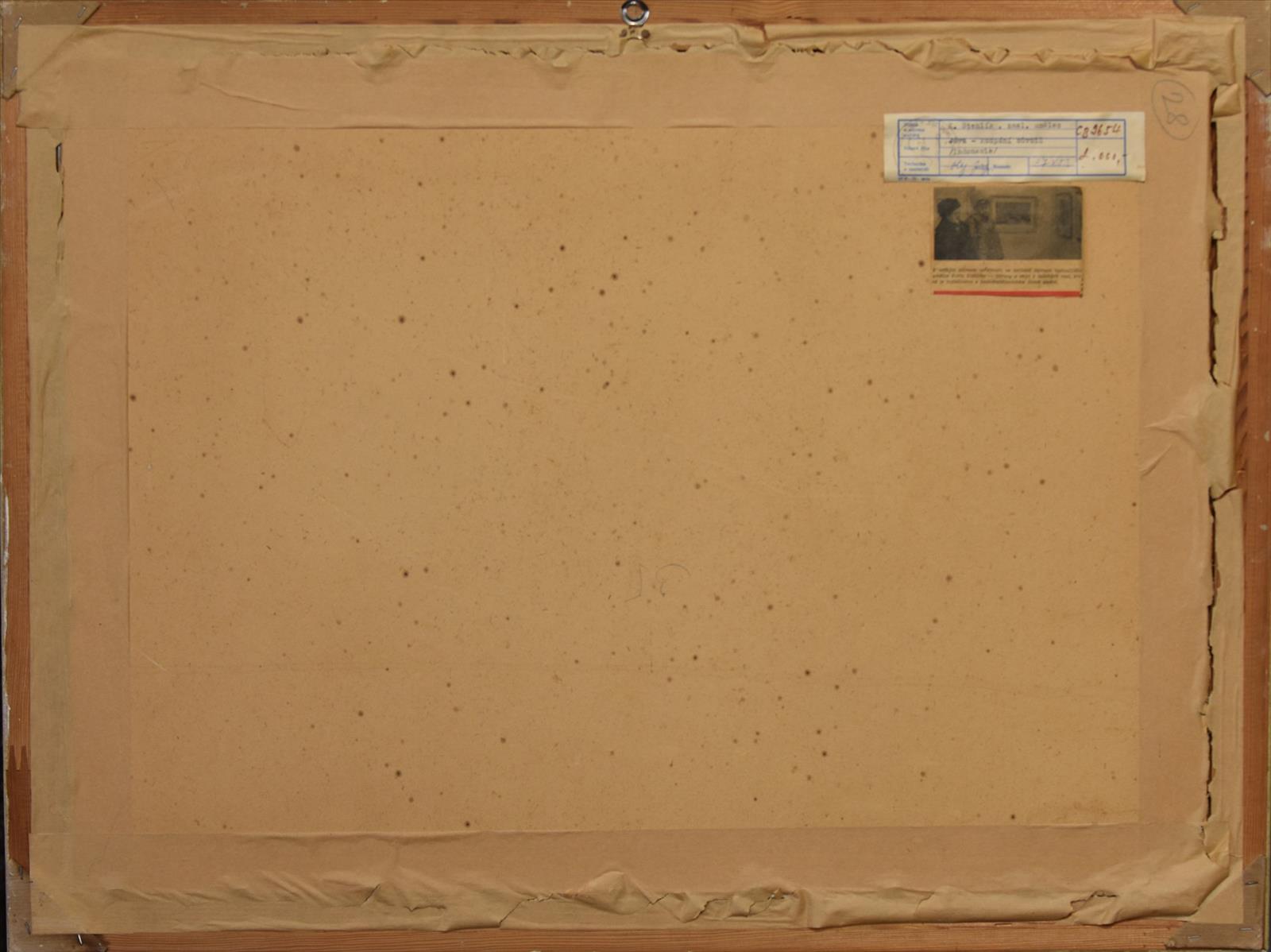 Kombinovaná technika, papír, 35 cm x 51 cm. Signováno vlevo dole. Zaskleno. Na zadní straně štítek autora.