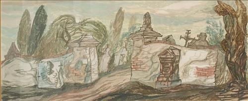Kvaš, 33 cm x 67 cm, signováno vlevo dole. Zaskleno. Datováno 1943.