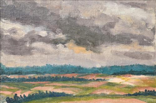 Olej, karton, 15 cm x 28,5 cm. Signováno a datováno vlevo dole. Rám poškozen. Pravost ověřil PhDr. Michael Zachař.