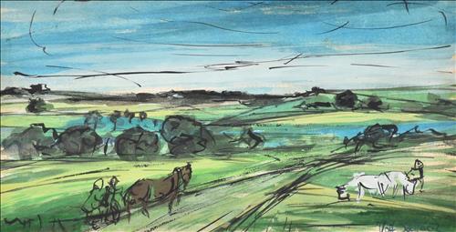 Kvaš, papír, 37 cm x 55 cm. Signováno a datováno 1954 vpravo dole. Zaskleno.