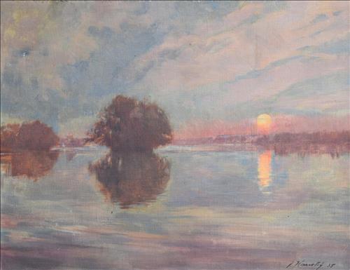 Olej, plátno, 48 cm x 62 cm. Signováno a datováno vpravo dole. Rám poškozen.