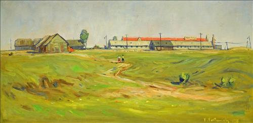 Olej, plátno, 55 cm x 110 cm. Signováno a datováno vpravo dole. Rám poškozen.
