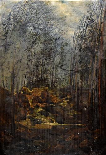 Olej, plátno, 96 cm x 66 cm. Signováno vpravo dole. Malba na více místech poškozena. Rám poškozen.
